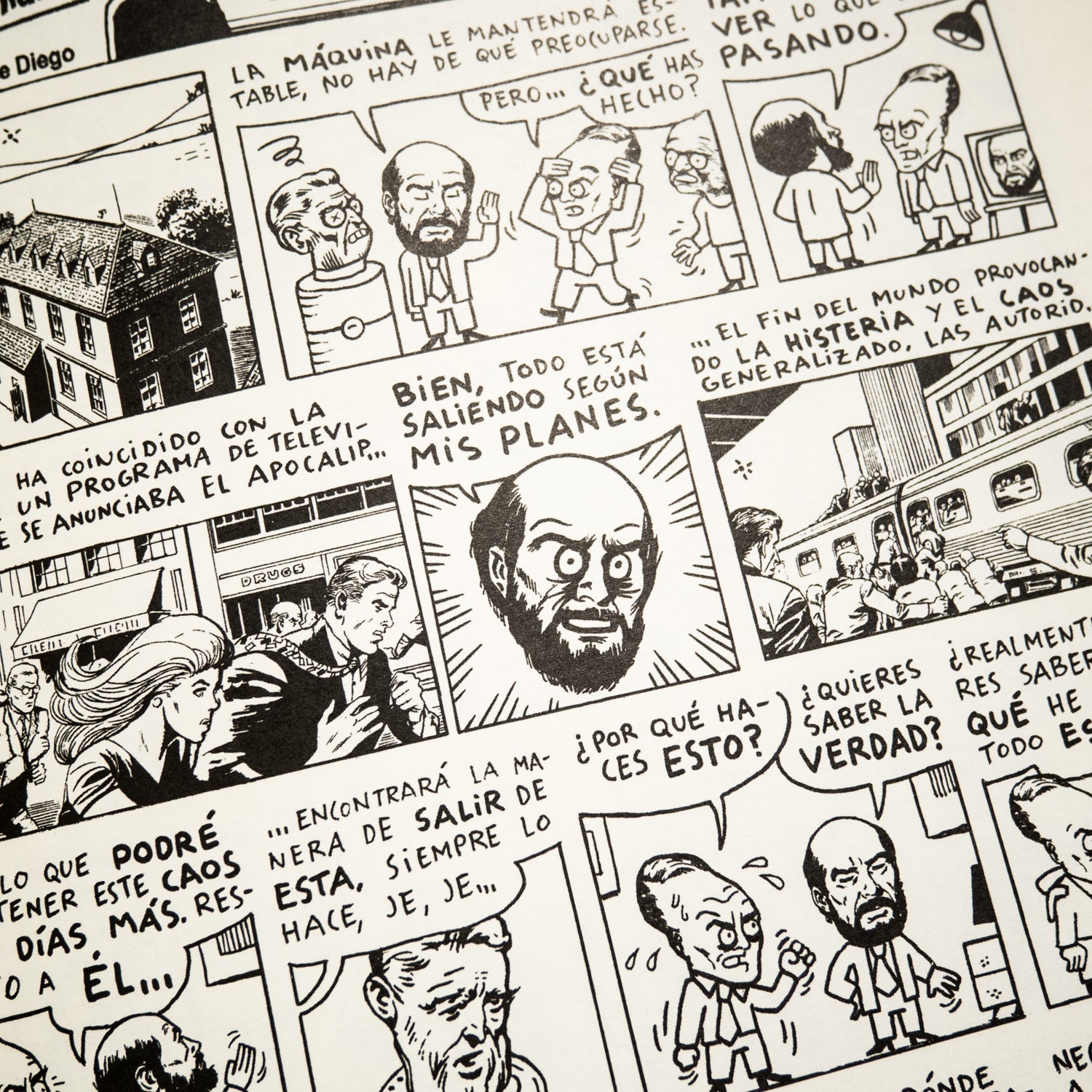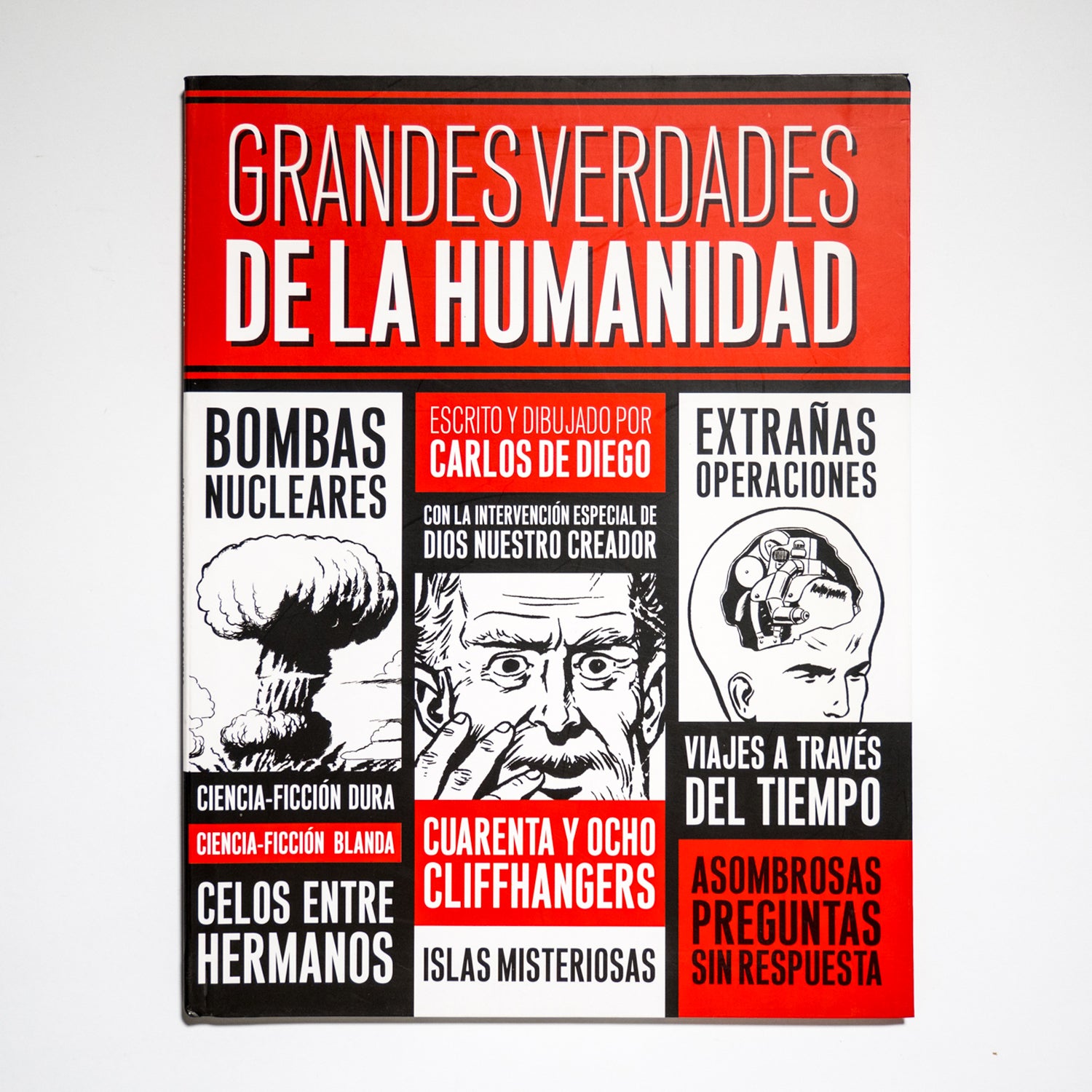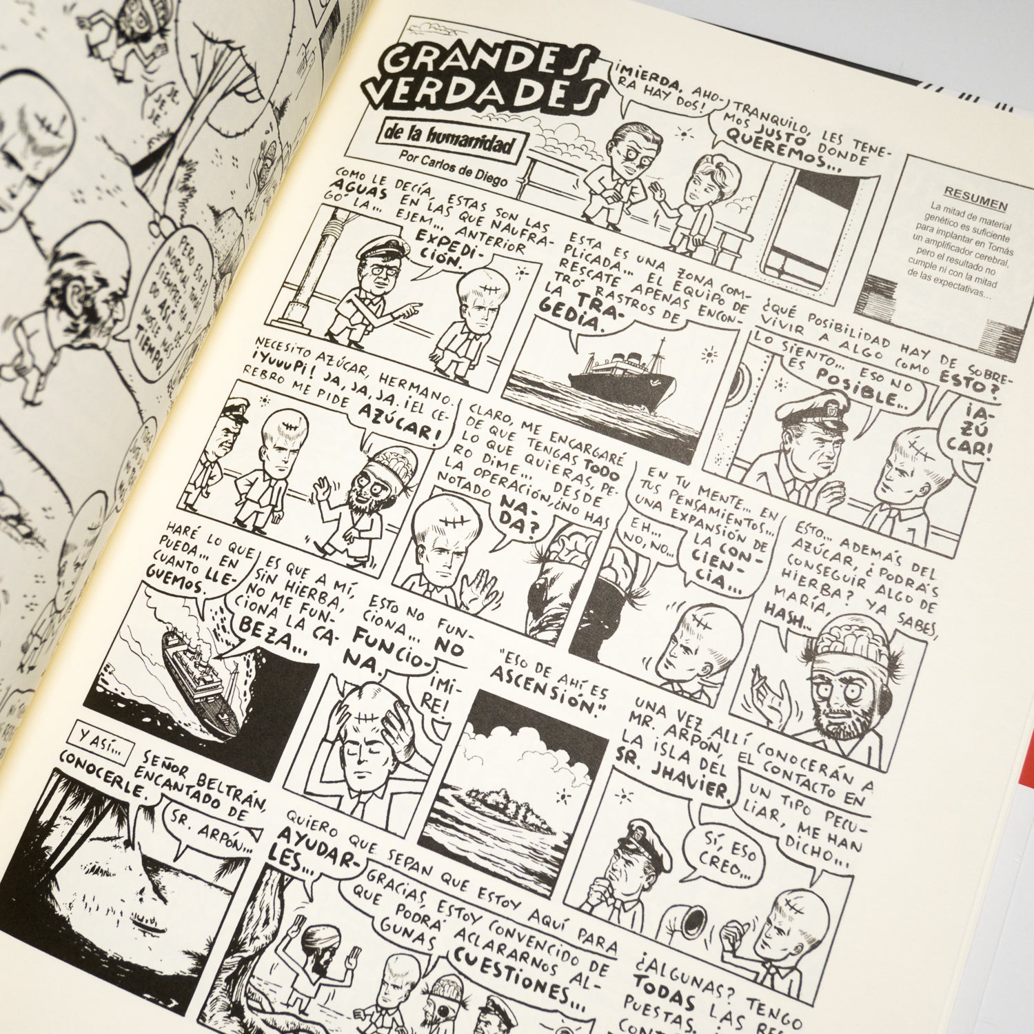 Grandes verdades de la humanidad es un cómic que ofrece lo que promete: la resolución, después de muchos cliffhangers, de enigmas trascendentales que nos afectan a todos. Definido por Jordi Costa en su prólogo como “una paráfrasis bufa de Perdidos”, es una aventura extrañamente tintinesca que une interrogación metafísica y continuará con unos personajes inolvidables: el muy frustrado Pedro, el taimado Luis, el mismísimo Dios y hasta el malvado Jhavier. Un cómic de aventuras que, como las mejores historias de Carlos de Diego, comienza de forma completamente anecdótica (con una asistenta comprando un bocadillo de jamón y queso para su jefe) para dar paso a un entramado de secretos familiares, extrañas operaciones e islas misteriosas.