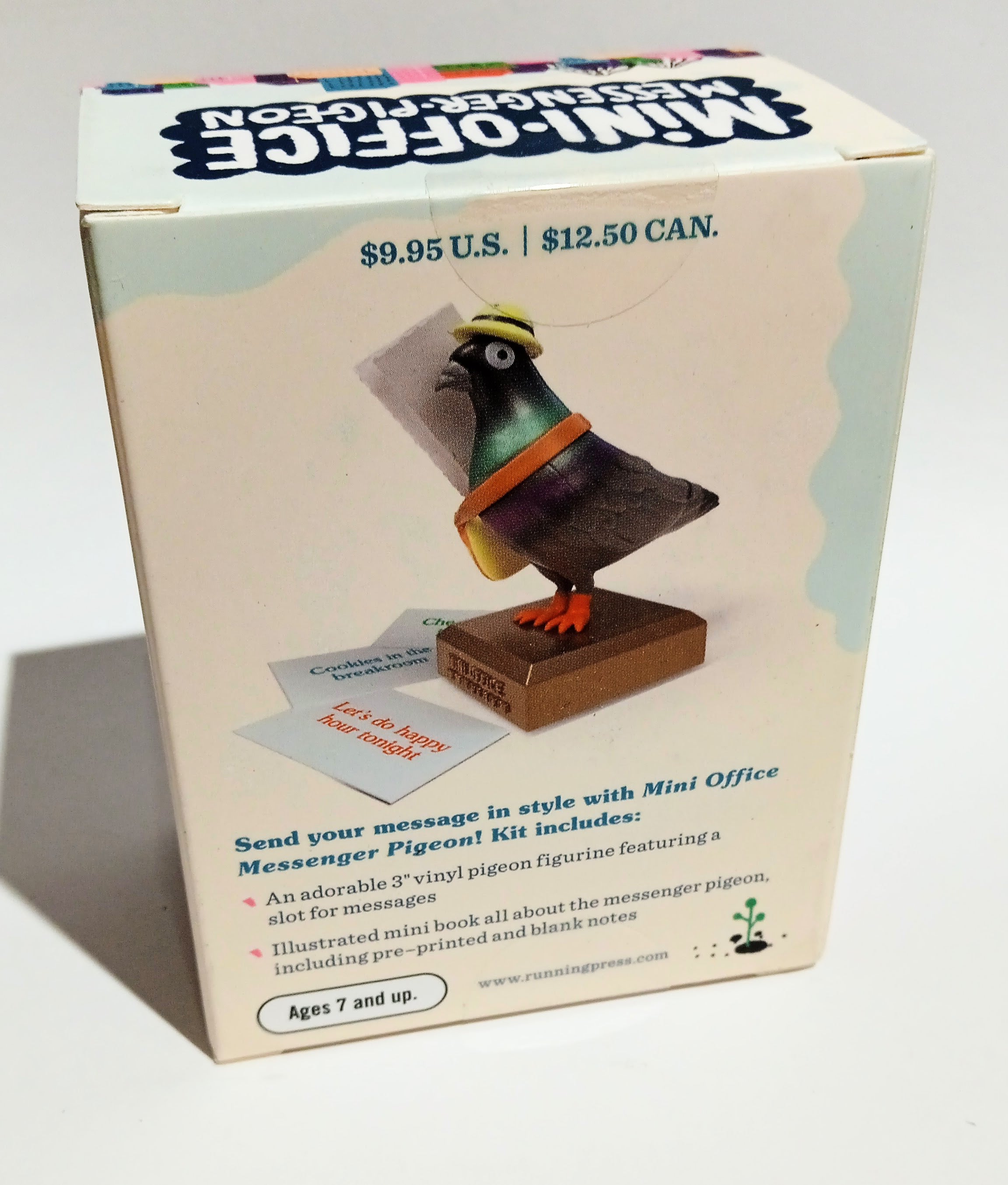 Kit includes everything you need to send a note with your own reliable avian. Specifications: 3" vinyl messenger pigeon figurine with a slot for notesIllustrated mini book: Includes 48-page mini book all about the messenger pigeon, along with 50 perforated pre-printed and blank message slips Great gift: A fun desk accessory gift for friends, family, and co-workers