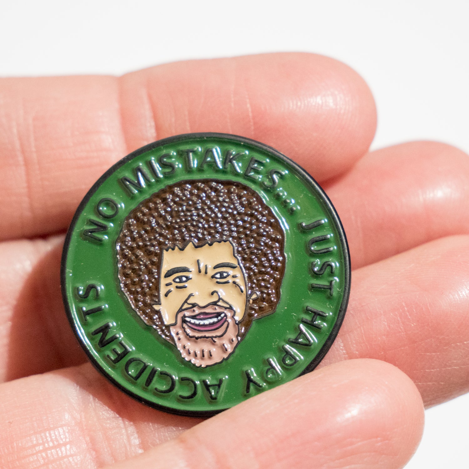 Pin de Bob Ross con la frase "No Mistakes. Just Happy Accidents"