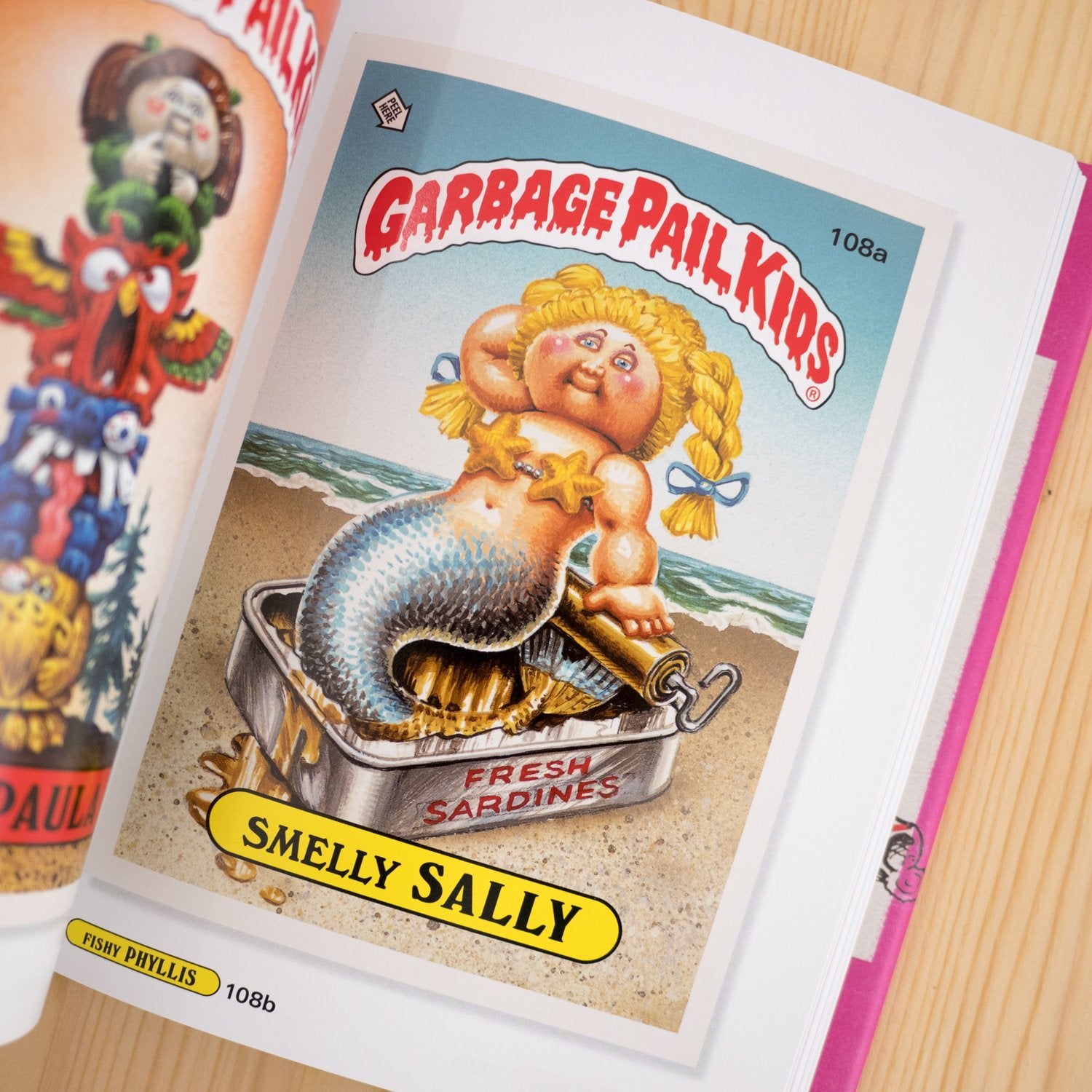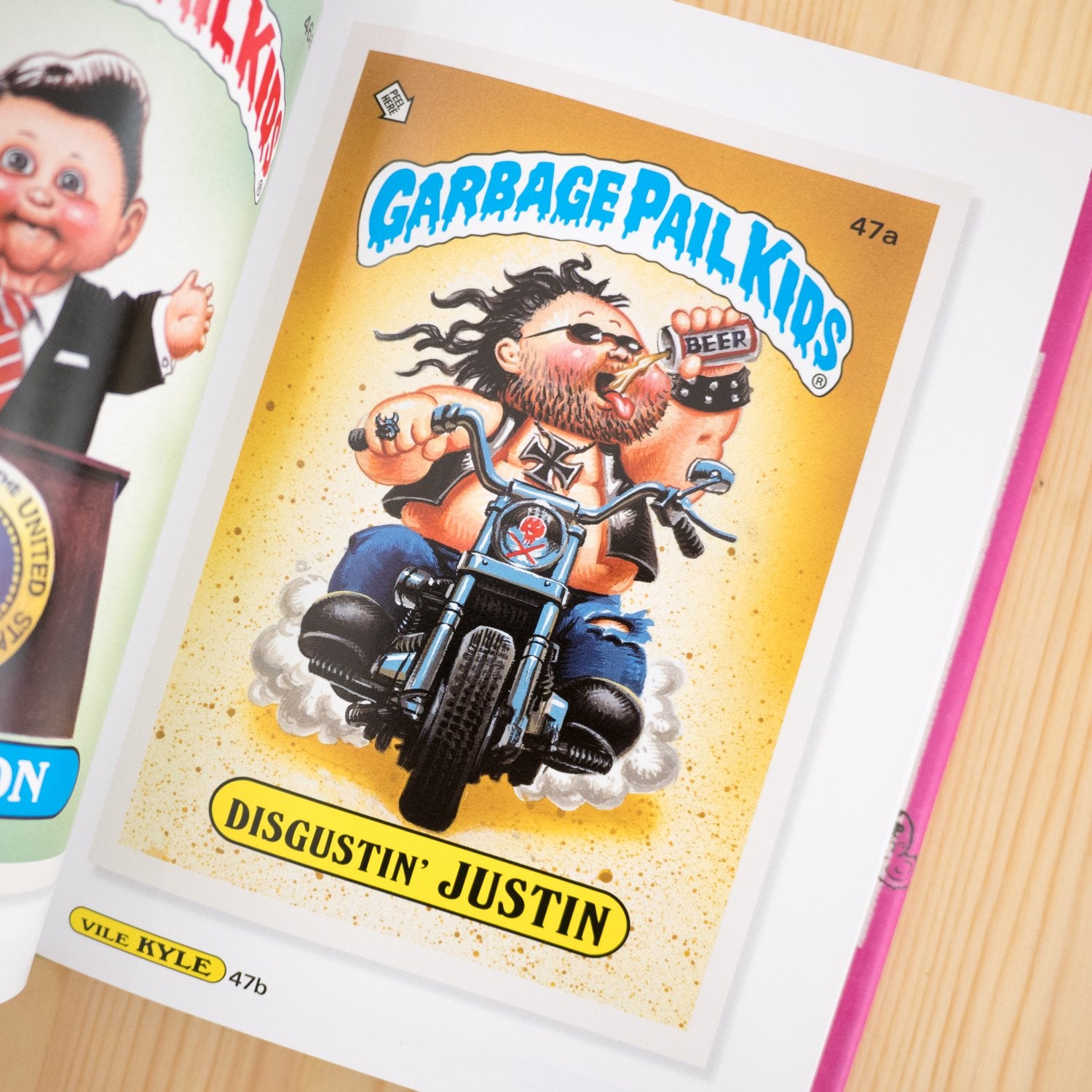 Garbage Pail kids, a series of stickers produced by Topps in 1985 were designed to parody overly saccharine Cabbage Patch Kids. Each sticker card features a Garbage Pail Kid character depicted in a grotesque and biting image, christened with a humourous character name involving wordplay. The series was the creation of Pulizer Prize-winning cartoonist Art Spiegelman, who in collaboration with other successful artists, turned the cads into a pop-culture phenomenon.